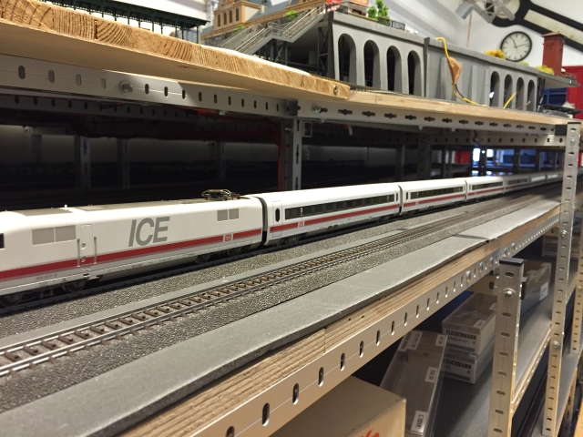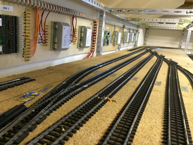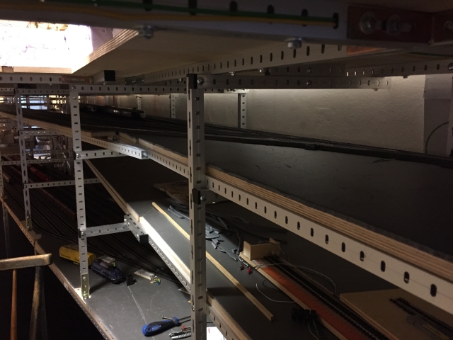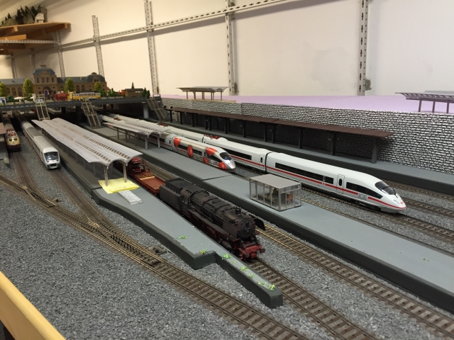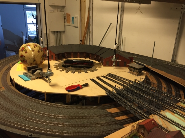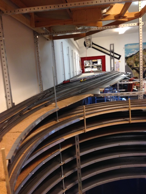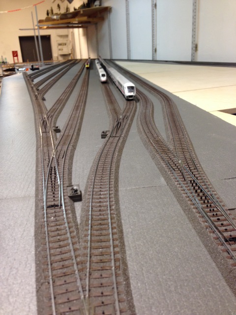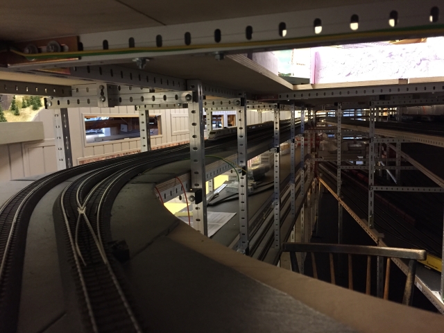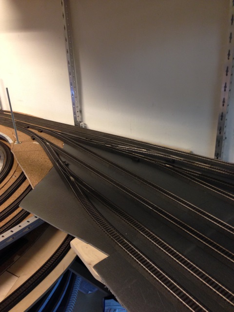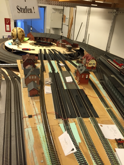 Nachdem Volker die Gleise für den Bahnhof fertiggelegt hatte, hat er in mehreren Wochen intensiver Arbeit den unter dem Bahnhof liegenden Schattenbahnhof 5 aufgebaut und an den Gleiswendel angeschlossen. Damit ist es nun mölich, die Züge vom Bahnhof über den Wendel zum Schattenbahnhof 5 und zurück zu fahren.