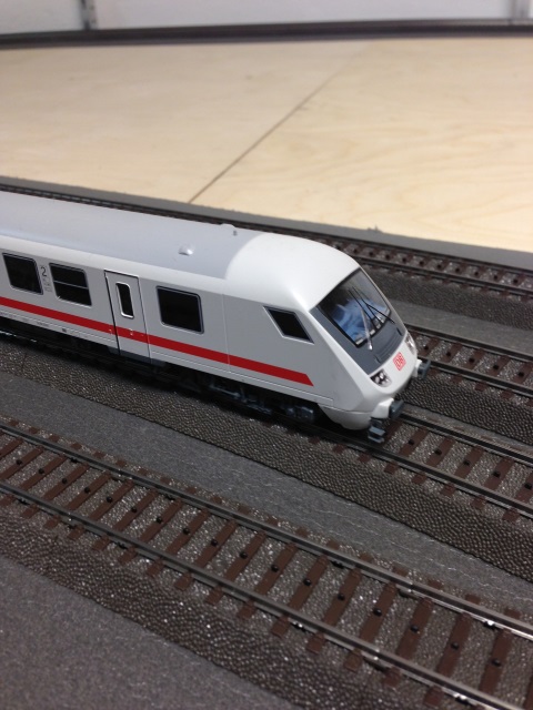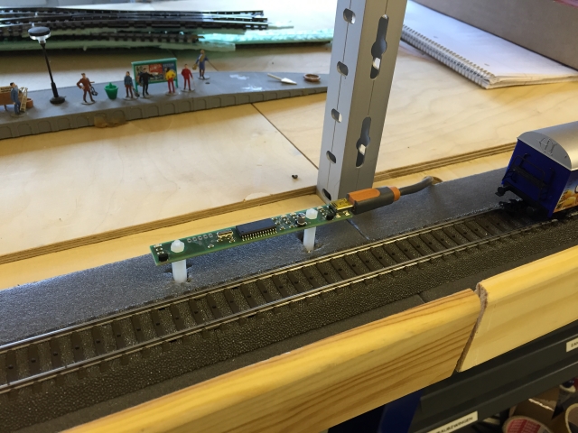 Das Gleisbild war entsprechend vorbereitet. Damit wir erste Züge mit Railware über die Anlage fahren können, mussten erst einmal die Loks eingemessen werden. Volker hat hierzu im hinteren Raum eine Einmessstrecke gebaut und den neuen RF-Sensor von Railware montiert. Die Anfahr- und Bremsverzögerung sowie die Maximalgeschwindigkeit musste mit Hilfe der CentralStation 2 für jede Lok eingestellt werden. Dann ging es ans Einmessen und siehe da, das neue Einmessverfahren via RF-Sensor ist deutlich schneller als das alte Verfahren. Dies ist sinnvoll gesparte Zeit, die man in andere Aufgaben investieren kann.