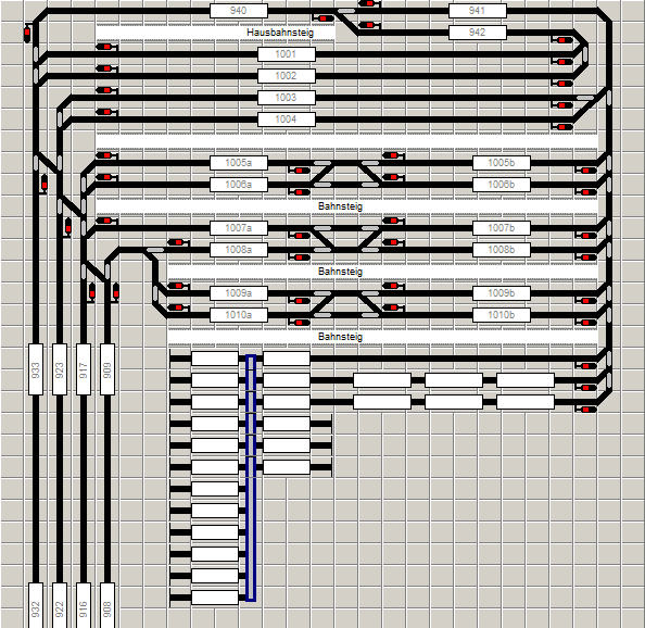 Volker hat sich hierbei einen Bahnhof ausgedacht, mit dem man einige typische Situationen in einem Großstadtbahnhof simulieren kann: Durchfahrgleise, Überholgleis, lange Bahnhofsgleise, kurze Bahnhofsgleise. Hierbei war es wichtig, dass alle Bahnhofsgleise in allen Richtungen aus dem Gleiswendel befahren werden können.