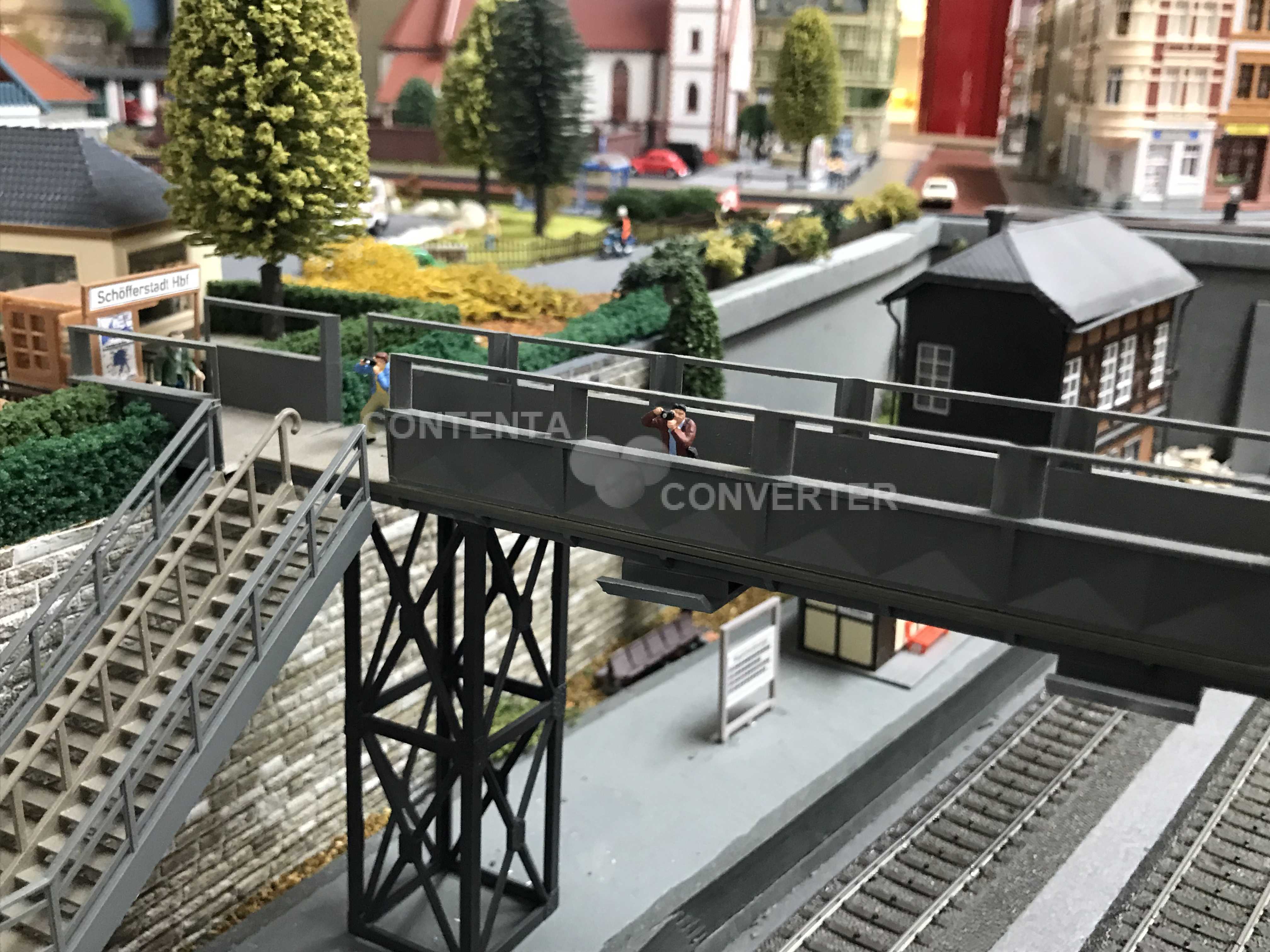 Falls Reisende schnell den Bahnsteig wechseln müssen, steht Ihnen natürlich ein entsprechender Übergang zur Verfügung. Ein Preiserlein schlendert ganz gemütlich über die Brücke. Anscheinend hat er viel Zeit.