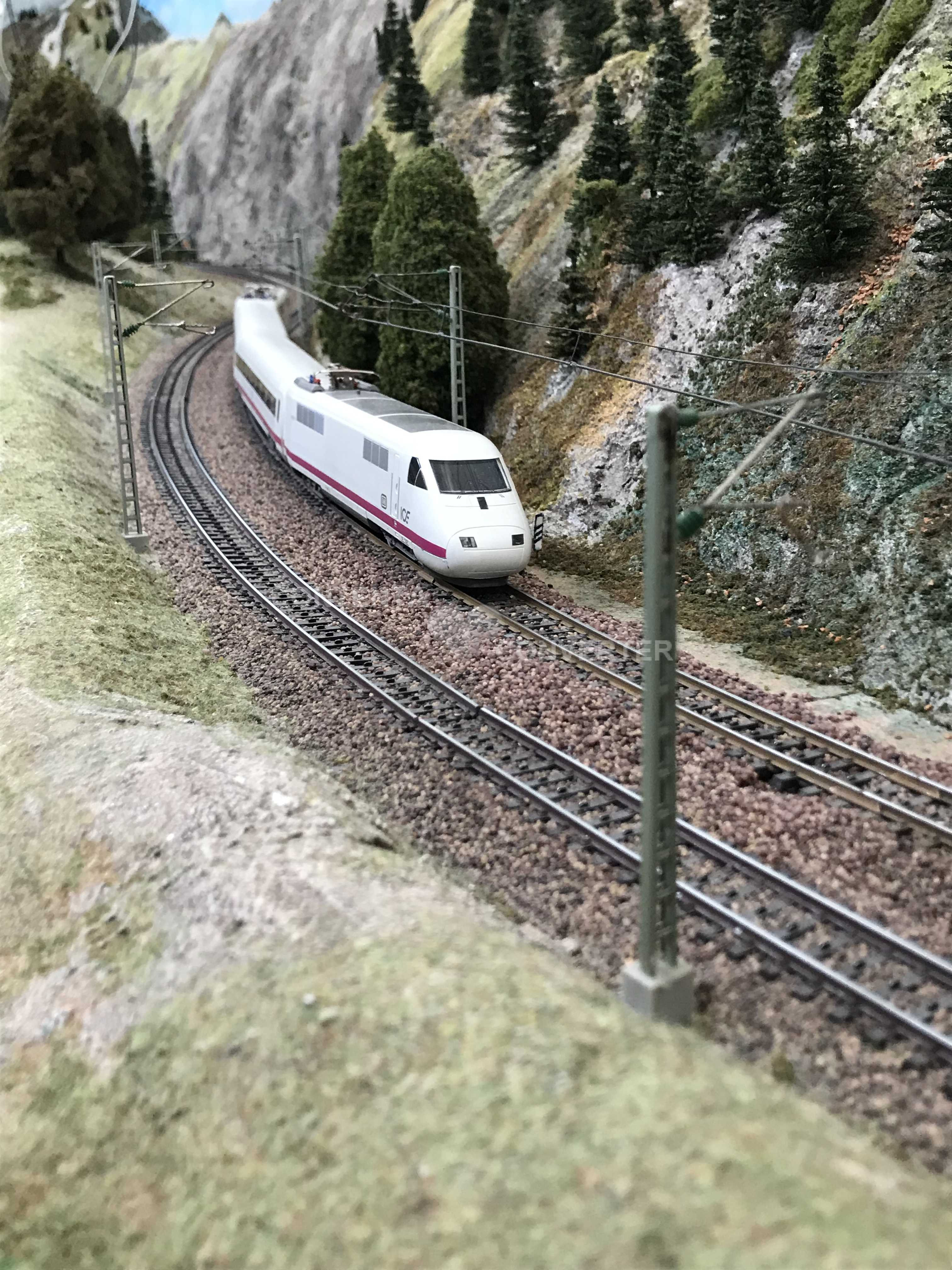Nachdem die Gleise der Paradestrecke durch Helmut befahrbar waren, hatte Volker nun den Stromanschluss gefunden und mit einem Booster verbunden. Volker und Gerd hatten dann am 10. Dezember 2016 Volkers ICE Experimental (mit mfx Decoder und sound) auf der Brücke aufgegleist und auf die Reise geschickt. Es hat funktioniert. Beide haben sich tierisch gefreut.