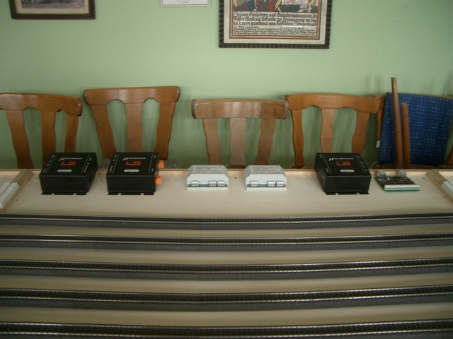 Stephan und Volker haben sich intensiv mit dem Digitalsystem beschäftigt. Nachdem Stephan die Rückmeldezentrale HSI-88 angeschlossen hatte, waren nun die Booster dran. Die Massoth-Booster wurden von Massoth so modifiziert, dass nun auch MFX-Signale übertragen wurden. Die Fahrsignale wurden auf die Massoth-Booster gelegt und so an die Boosterkreise verteilt. Die Schaltsignale wurden auf den Märklin-Booster, der direkt an der CS2 angeschossen ist, abgenommen. Hier hatte Volker sehr viel Arbeit. Er probierte und probierte und probierte, bis das Resultat endlich Volkers Vorstellungen entsprach.