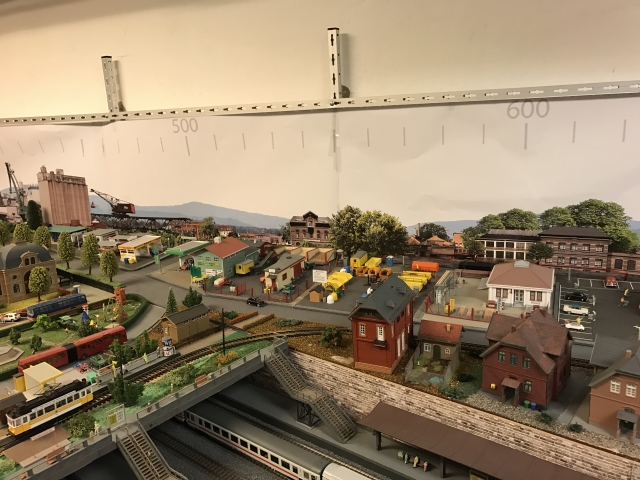 Auf diesem Bild ist der Verlauf der Straße von der Stadt und der Brücke sehr gut einzusehen. Volker hat hier sehr genau gemessen, so dass die Brücke auch die erforderliche Höhe hat, damit die Züge nicht hängen bleiben.