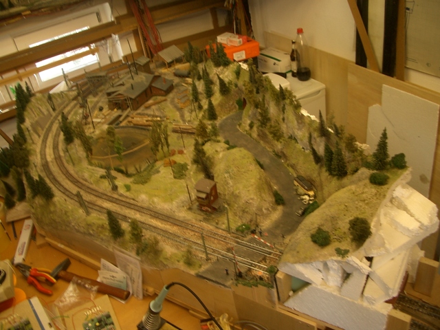 Hinter dem Sägewerk richtete Volker und Gerd auch gleich einen kleinen Schattenbahnhof mit einer Kehre ein, so dass dann wieder der Hauptbahnhof angefahren werden kann.
