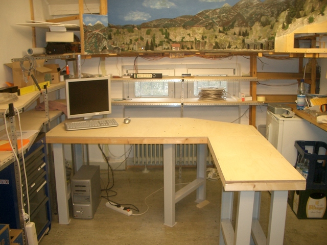 Gleichzeitig wurde der neue Leitstand positioniert und grob vorgebaut. Wir benötigen hier Platz für 6 Monitore, 4 Computer, der Digitalzentrale sowie dem Programmiergleis. Das ganze wird noch eine halbrunde Tischplatte bekommen. Platz für zwei Schreibtischstühle ist auch vorhanden, so dass 2 Clubmitglieder den Leitstand dann bedienen können.