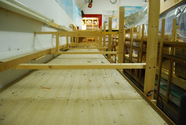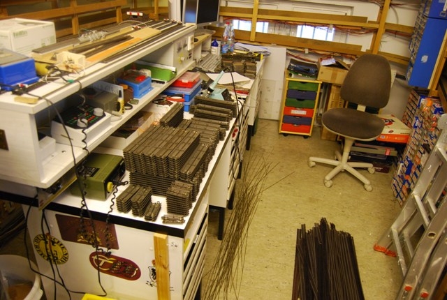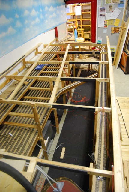 Nach der Leere in unseren Räumen stand der Wiederaufbau an. Wir haben uns entschieden, kein Holz mehr sondern Vierkant-Aluprofile als Unterkonstruktion zu verwenden. Dies ist sehr stabil und arbeitet nicht mehr, so wie unsere alte Holzkonstruktion. Wir verwenden auf der Unterkonstruktion 18mm starke Multiplexplatten und haben diese mit einer Art "Moosgummi" zur Geräuschdämmung beklebt. Darauf haben wir die K-Gleise mit Nägeln befestigt.