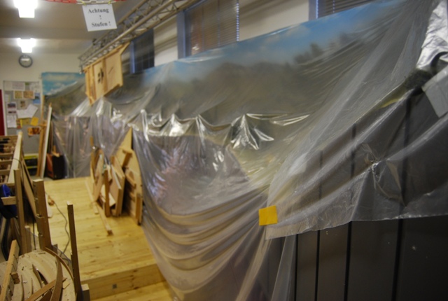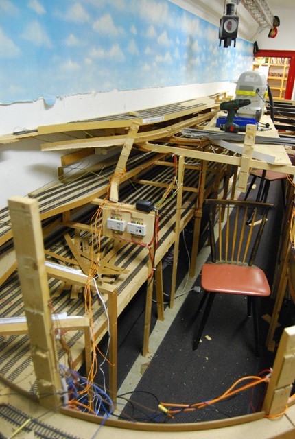 Es hat schon sehr weh getan, die Anlage Schritt für Schritt abzureisen. Wenn wir aber einen sicheren Bahnbetrieb ermöglichen wollen, war dieser Schritt unabdingbar. Alle Mitglieder haben mitgeholfen die Schienen, die Signale und die Kabel zu entfernen sowie die Holzkonstruktion abzubauen. Die noch verwendbaren K-Gleise wurden gesammelt, die anderen mussten zusammen mit dem Holz entsorgt werden. Die C-Gleise sowie die Märklin- und Viessmann-Decoder haben wir auf unseren Börsen größtenteils verkaufen können. Um die Paradestrecke mit unserer großen Brücke vor Schmutz zu schützen, haben wir diesen Bereich wieder einmal eingepackt.