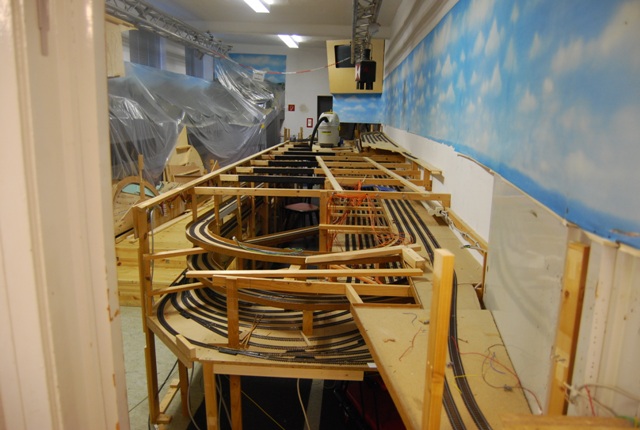 Wir konnten 2010 die grobe Konstruktion des Gleiswendels mit dem ersten 360 Grad Kreis sowie die untere Ebene mit Holz fertigstellen. Auf dieser Ebene konnten wir den Großteil der K-Gleise bereits montieren. In der alten Anlage haben wir Leuchtstoffröhren zur Beleuchtung der Schattenbahnhöfe verwendet. Jetzt gehen wir mit der Zeit und wir haben uns Lichtschläuche besorgt. Diese sind sehr einfach zu montieren, geben helles Licht ab und verbrauchen auch weniger Strom.